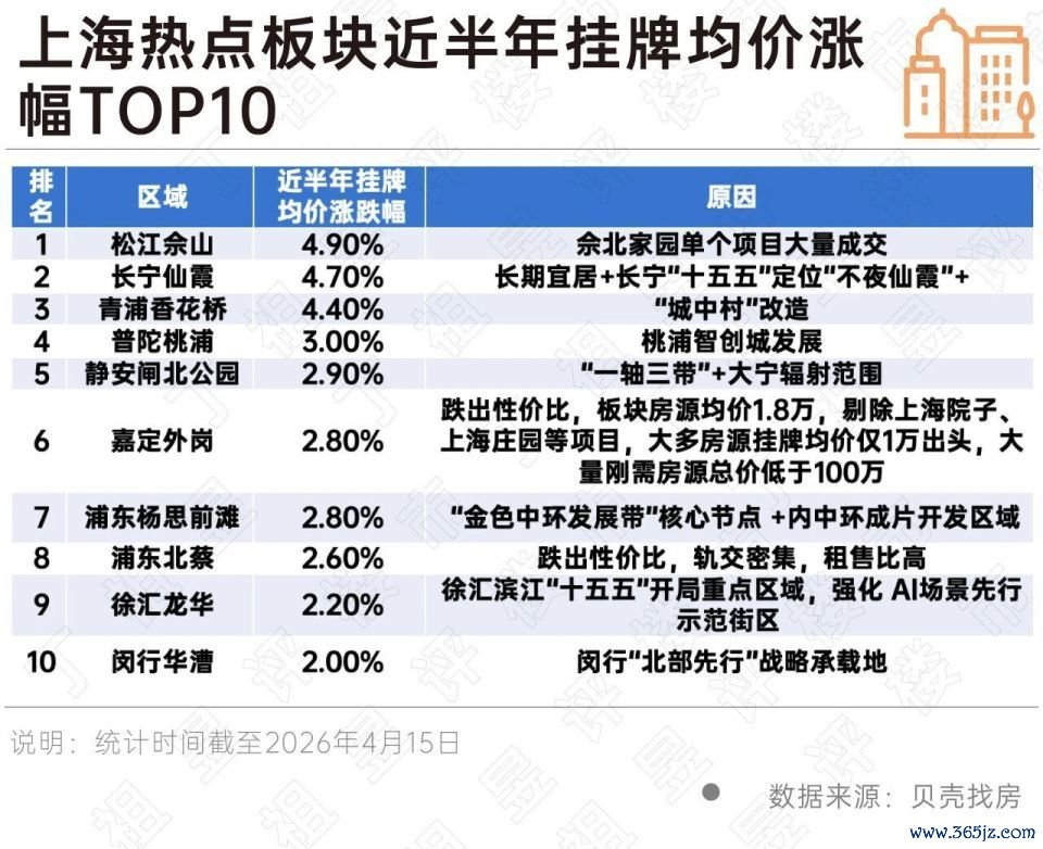 其次是长宁仙霞、普陀桃浦、静安闸北公园、浦东杨思前滩、徐汇龙华、闵行华漕等明显受城市界面提升影响,带动整体均价上涨。