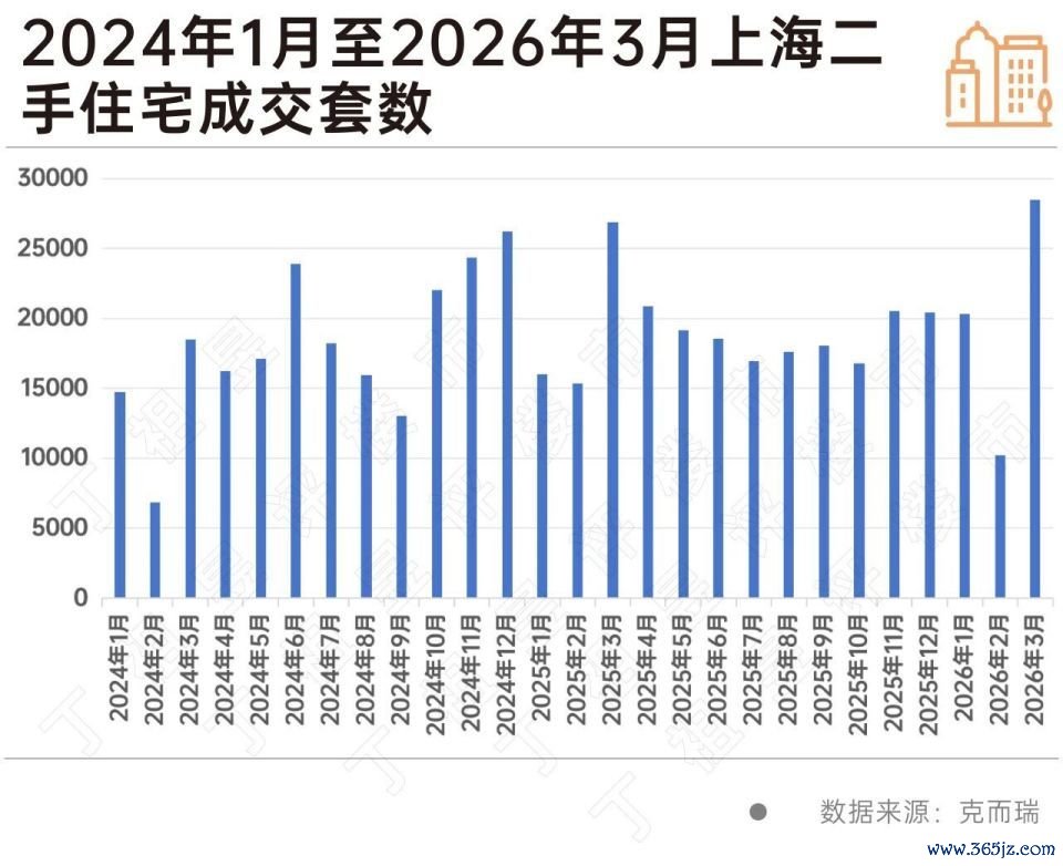 克而瑞数据显示,2026年3月上海二手住宅成交28492套,在2025年3月较高基数背景下同比增长6%,成交套数创近5年新高。